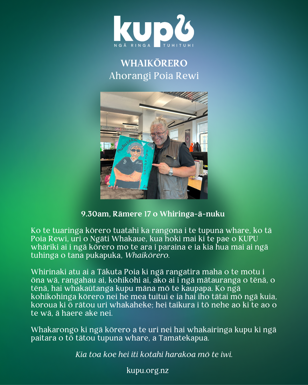 Ko te tuaringa kōrero tuatahi ka rangona i te tupuna whare, ko tā Poia Rewi, uri o Ngāti Whakaue, kua hoki mai ki te pae o KUPU whāriki ai i ngā kōrero mo te ara i paraina e ia kia hua mai ai ngā tuhinga o tana pukapuka, Whaikōrero.