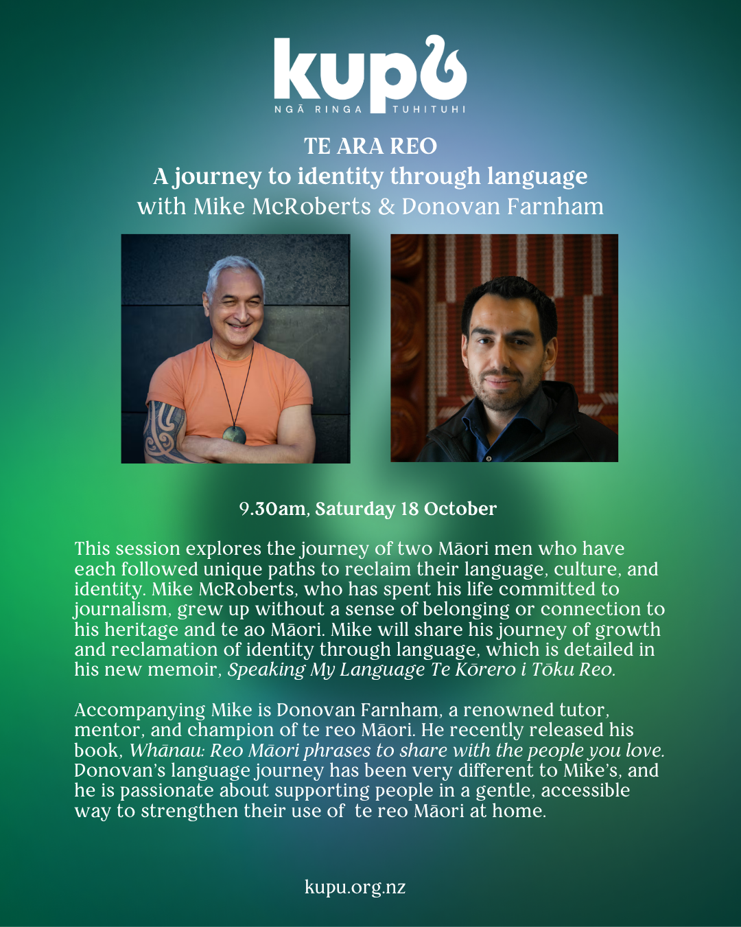 This session explores the journey of two Māori men who have each followed unique paths to reclaim their language, culture, and identity. Mike McRoberts, who has spent his life committed to journalism, grew up without a sense of belonging or connection to his heritage and te ao Māori. Mike will share his journey of growth and reclamation of identity through language, which is detailed in his new memoir, Speaking My Language Te Kōrero i Tōku Reo.