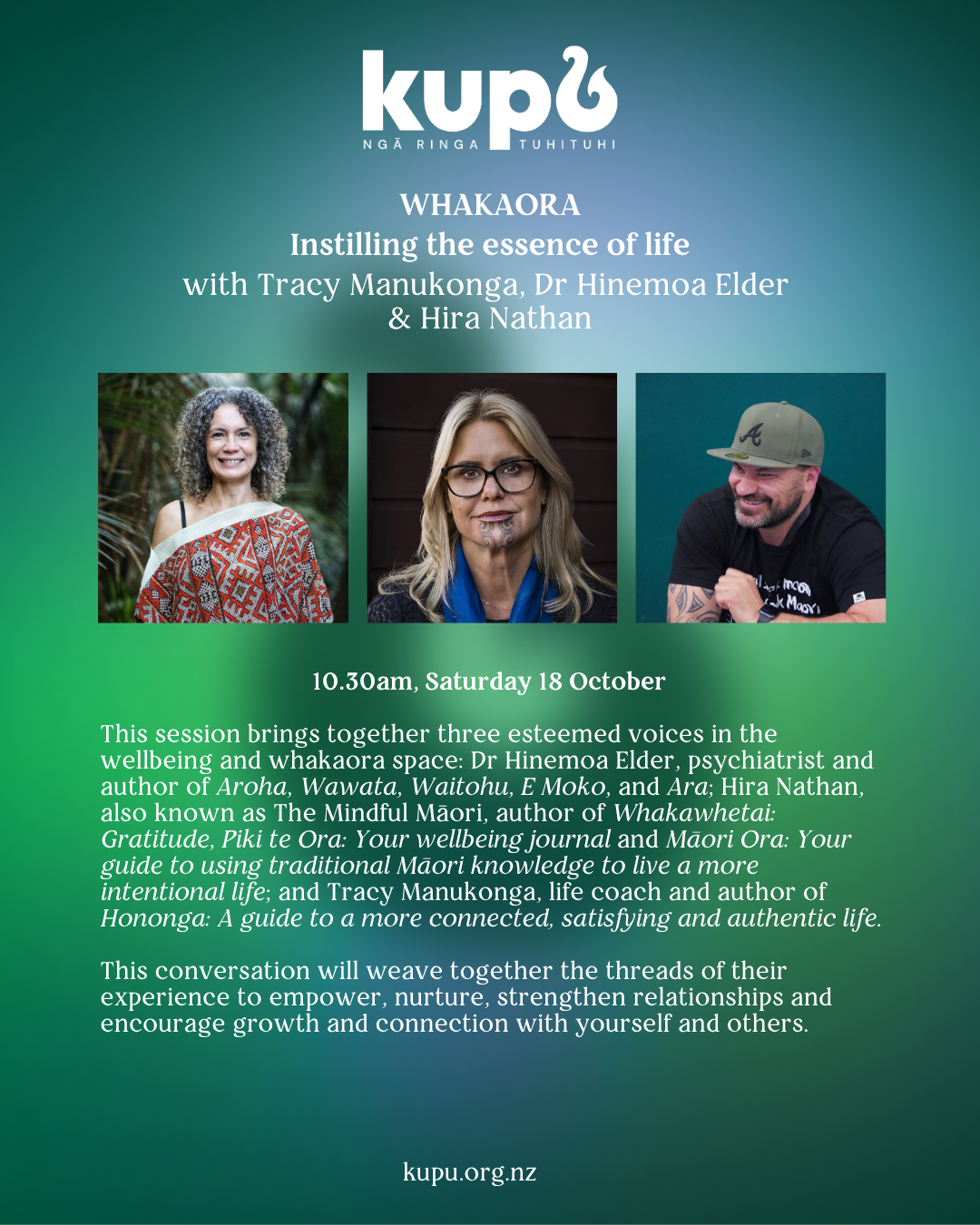 This session brings together three esteemed voices in the wellbeing and whakaora space: Dr Hinemoa Elder, psychiatrist and author of Aroha, Wawata, Waitohu, E Moko, and Ara; Hira Nathan, also known as The Mindful Māori, author of Whakawhetai: Gratitude, Piki te Ora: Your wellbeing journal and Māori Ora: Your guide to using traditional Māori knowledge to live a more intentional life; and Tracy Manukonga, life coach and author of Hononga: A guide to a more connected, satisfying and authentic life.