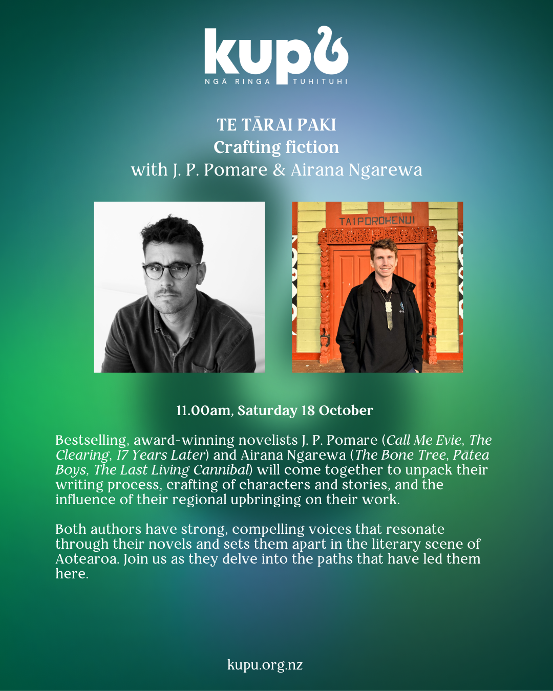 Bestselling, award-winning novelists J. P. Pomare (Call Me Evie, The Clearing, 17 Years Later) and Airana Ngarewa (The Bone Tree, Pātea Boys, The Last Living Cannibal) will come together to unpack their writing process, crafting of characters and stories, and the influence of their regional upbringing on their work.