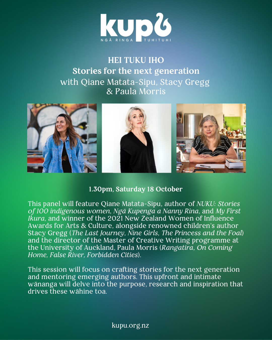 This panel will feature Qiane Matata-Sipu, author of NUKU: Stories of 100 indigenous women, Ngā Kupenga a Nanny Rina, and My First Ikura, and winner of the 2021 New Zealand Women of Influence Awards for Arts & Culture, alongside renowned children’s author Stacy Gregg (The Last Journey, Nine Girls, The Princess and the Foal) and the director of the Master of Creative Writing programme at the University of Auckland, Paula Morris (Rangatira, On Coming Home, False River, Forbidden Cities).